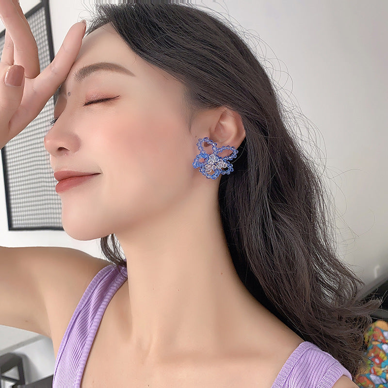 925 Silver Needle Crystal Flower Hand-Beaded Earrings Woven Petal Drop Earrings
